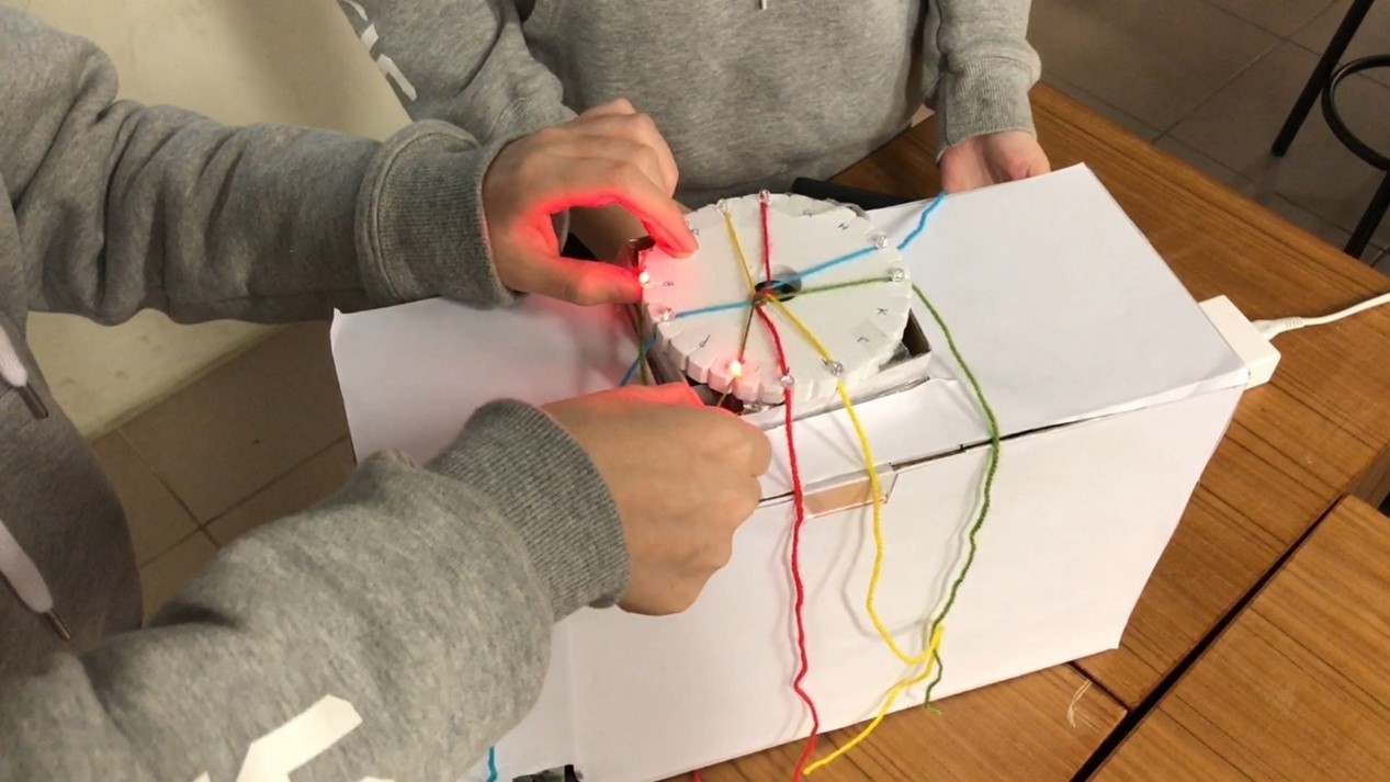 圖6 周愉芯、蘇煊甯同學製作的手繩編織器,最高分的作品,單純利用LED閃爍的原理所製作 (圖片來源: 黃信惠拍攝)