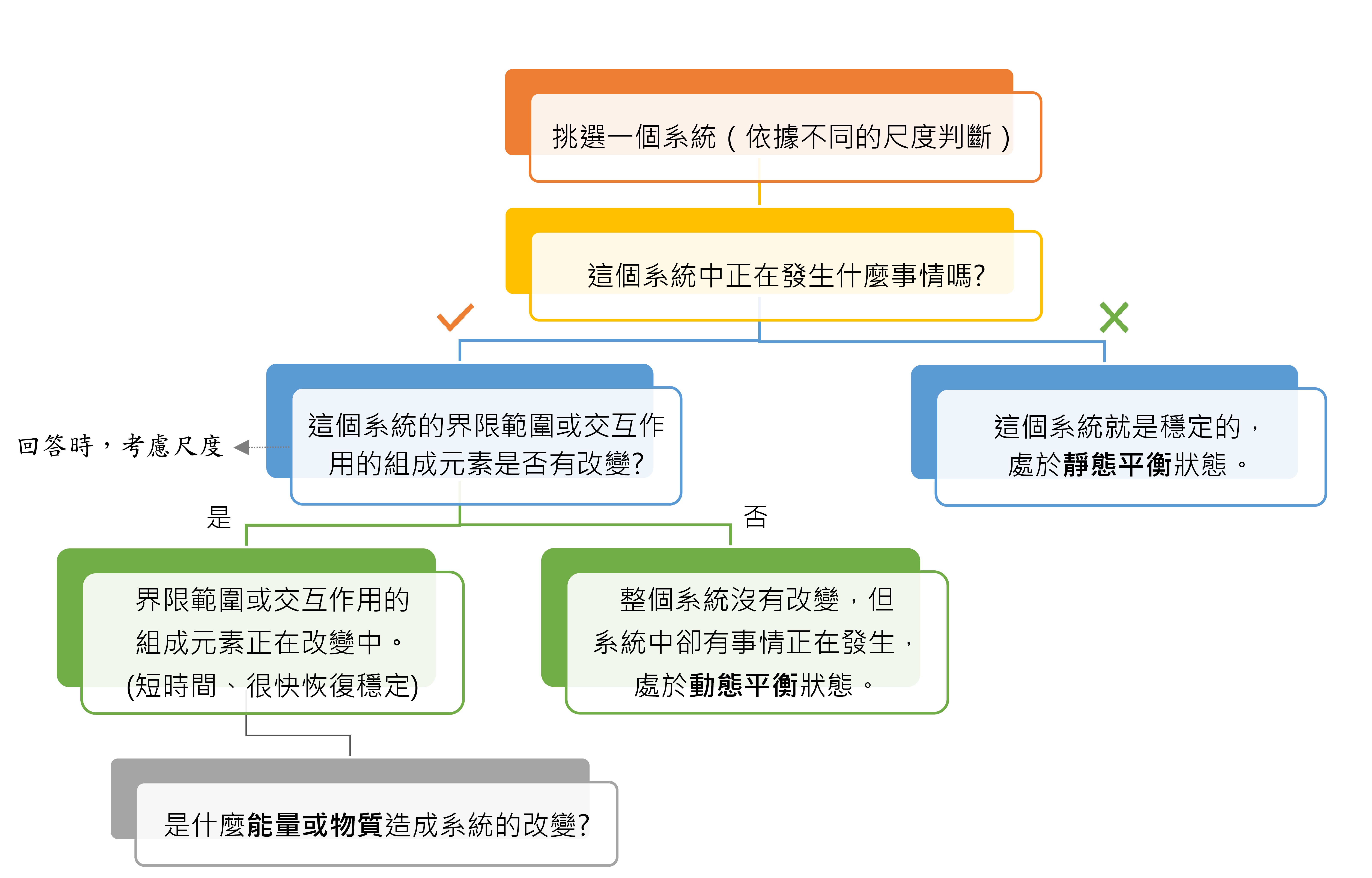 究竟要如何分辨一個系統是穩定的,還是正在改變中?「尺度」就是一個鮮明的指標。若以「時間」之尺來看一個六歲的孩子,不論是一天或是一星期來看,孩子的模樣及行為似乎沒有太大的變化(穩定),這期間的改變用肉眼實在難以察覺。但若將時間尺度拉長至十年來看,便可以看出這個孩子已經是一位活力充沛的青少年了(改變)。在成長的期間,我們可能從掉牙、生理器官的成熟(動態平衡),察覺他/她(系統)正在改變中,一旦長出了新牙及生理器官發展完全,即代表此系統建立了一個新常態,而我們也知道,這可能只是暫時性的穩定狀態,因為孩子仍在成長。