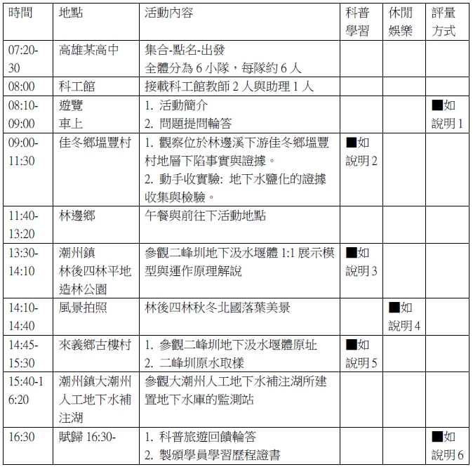 本科普旅遊活動之行程規劃,考量科普學習與休閒娛樂之需要,特以高雄市立楠梓高中師生參加在水一方-二峰圳之行程安排為例(如表一),分別標示科普學習、休閒娛樂與評量方式之內容,以作為有意參辦或續辦之參酌。