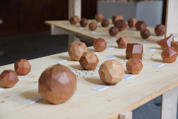 2019年4月8日至28日,我們再次和吳寬瀛老師、沈岳霖老師合作,於國立嘉義大學民雄校區大學館策畫了一場前所未見的大型數學幾何藝術特展《幾何之森》。此次特展主要展示從球體衍生的最基本立體-柏拉圖立體、阿基米德立體、以及疊合體等。正如『典雅的幾何』書內序文所提:「自古以來,這些美麗的立體是探索數學和藝術的基石,雖歷經無數世代,仍叫人著迷、予人啟迪和鼓舞。」透過建構及展示大型的多面體木作(高度1.5至3公尺),能讓觀展者感受領略對稱性與結構性之美,不僅得到知識性的啟發,更可身歷其境感受藝術創作者所展現之獨特創意(圖4)。2019年10月至12月,《幾何之森》正式踏出嘉義,展開了大學校院藝文空間的巡迴,第一站是崑山科技大學,第二站則是屏東科技大學。2020年11月至2021年1月,吳寬瀛老師更以《幾何之森》為名分別於臺南文化中心和靜宜大學藝術中心辦理個人創作展,希望能讓不同縣市的民眾能確實感受到數學幾何驚異的魅力。