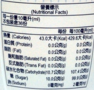 .T :「注意看標示圖喔!10毫升的豐年果糖會產生43大卡的熱量。」