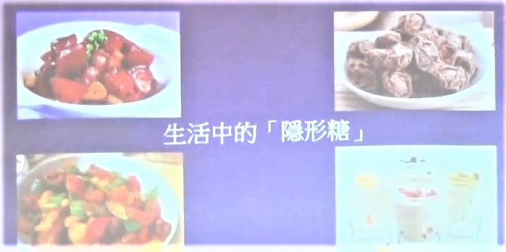.T:可是我們平常吃到的食物不只飲料含有糖分喔!投影片裡面的食物,都是含有一些糖分的食物。所以剛剛600毫升的飲料雖然只有半糖,但是就已經產生96.75大卡了,這時候你再吃進去其他含糖食物,就很容易超過100大卡囉!