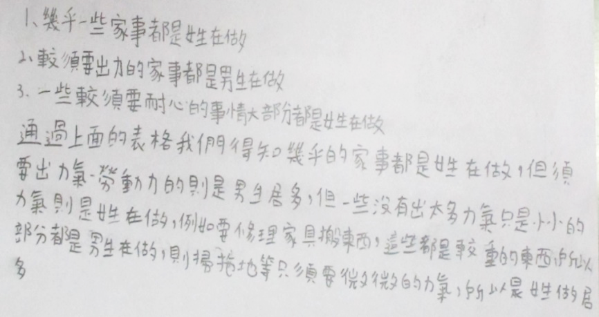 T: 「同學們都寫得很好,雖然覺得家事幾乎都是女生在做,不過也發現到需要出較多力氣、勞動力的家事則是男生做居多,或許某種角度可以視為是一種男女雙方的調和。大家覺得呢?」
