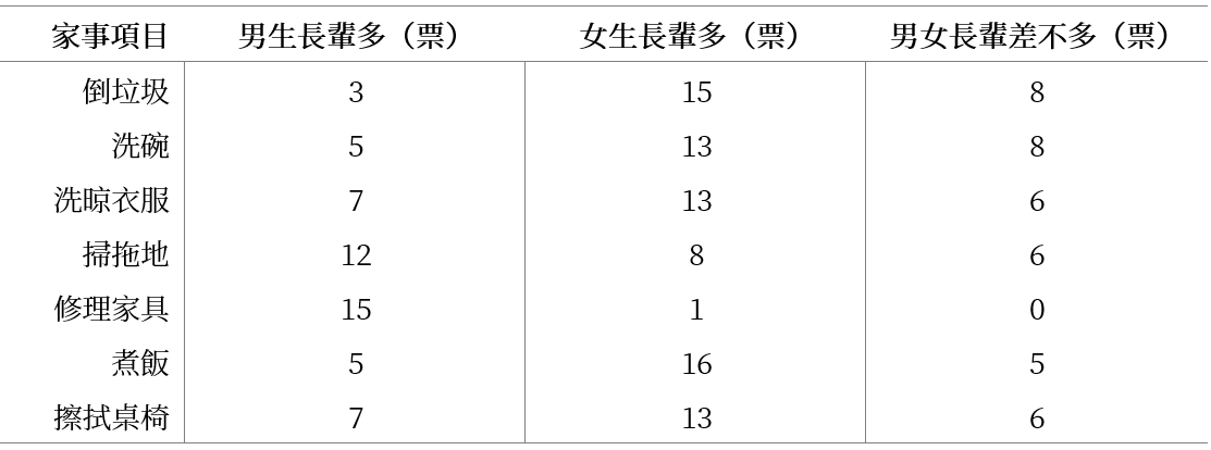 在老師解決了學生的誤解之後,此時又有學生S18(女)表示:「可是我家還是有一些男女不平等的事,像我爸媽每次做完生意回家後,明明我媽跟我爸是一起工作(市場賣魚攤販),回家之後,我媽還要忙著做一堆的家事,我爸就只有在客廳翹著二郎腿滑手機、看電視,什麼都不用做…我看我媽都累得要死…」,另一個學生S24(女)也問:「像我們假日回阿嬤家,也都只看到都是我阿嬤、我阿姨在做家事而已…男生真的都不用做耶…」,不過S11(男)卻說:「可是我家我媽都沒有在做家事,都是我爸做啊…」,此時全班同學針對「家事誰做得比較多?」討論熱烈,於是教師布了一個教學活動—「家事分工大調查」,由學生先決定常見的家事有七項,再針對這七項家事進行投票,教學片段2如下: