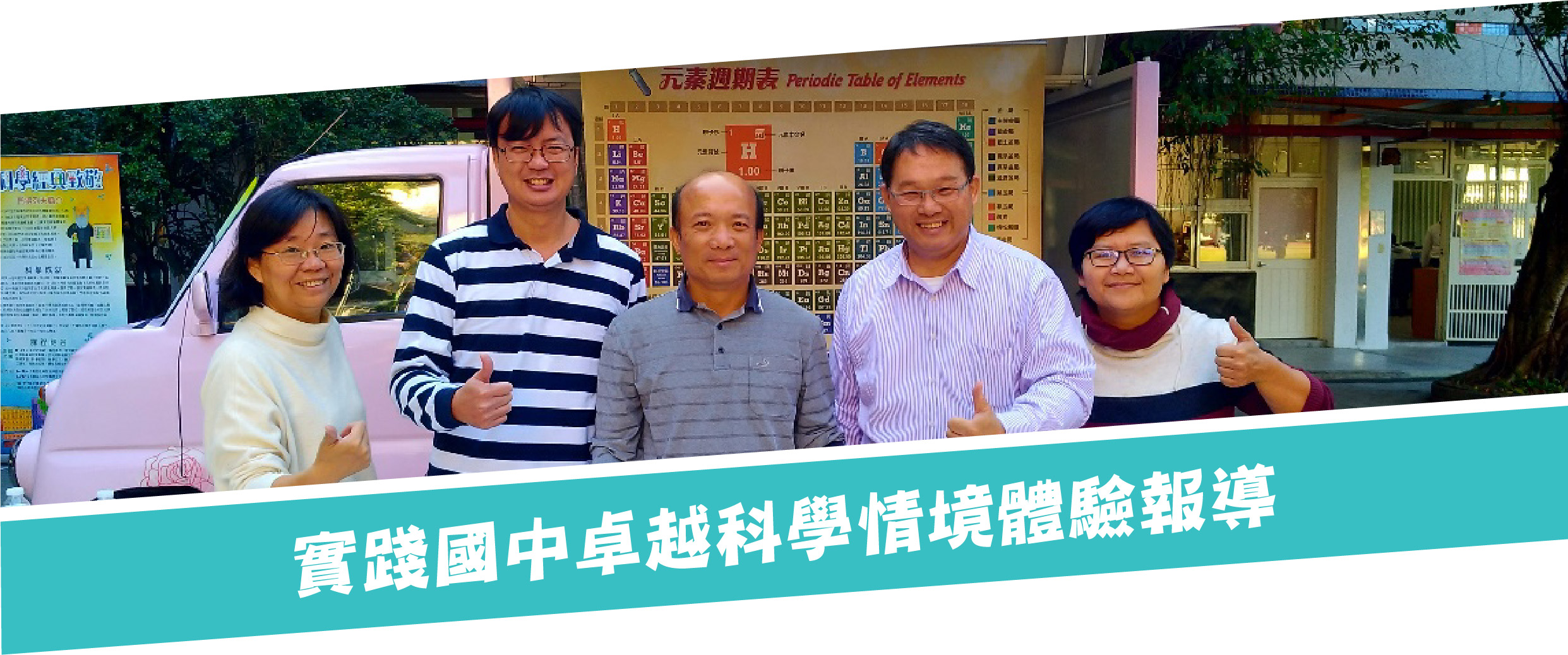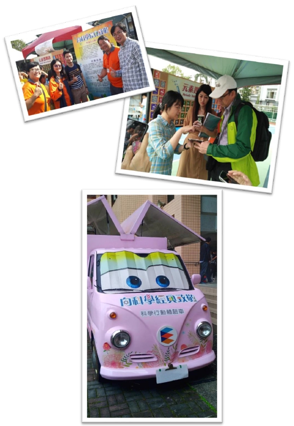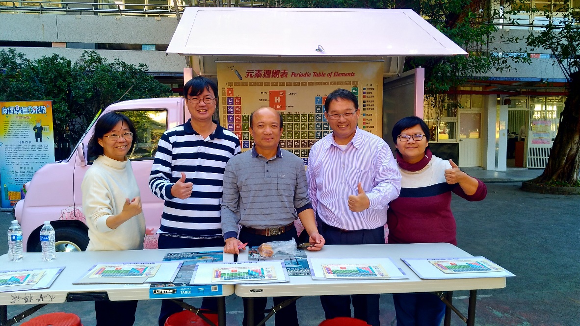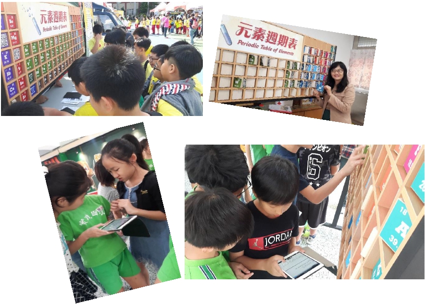 台北市自2014年起啟動「中小學卓越科學教育推動計畫」(台北市教育局,2014),2018年度卓越科學計畫以「向科學經典致敬」為主軸,鼓勵各校提出競爭型的科創計畫。實踐國中的週期表教學設計,是以遊戲的方式,將各個元素知識融入活動中,兼顧知識記憶、理解、應用、分析,讓抽象艱澀的化學元素符號更有親和力、更具體,學生的學習也更方便了解。教師們透過自行開發的週期表翻翻樂教具、運用APP技術設計QR-code,以及運用ipad平板電腦等行動載具,設計「歡樂對對碰」等一系列創意教學,引導學生對科學知識發現歷程的了解,進而引起對科學知識學習、研究與探索的興趣,以啟發學生對週期表的認識以及科學的喜好,提高對化學知識及其應用等相關概念的瞭解,深化科學素養。實踐國中自然領域教學團隊為了推廣科普知識,更以可愛的胖卡車等行動列車的方式,將週期表教學帶到社區小學進行教學與分享,讓門得列夫週期表的種子,走入小學校園,向下扎根,埋下科學的希望種子,期望更多下一代能提早開展科學興趣及培養科學素養(見圖1)。