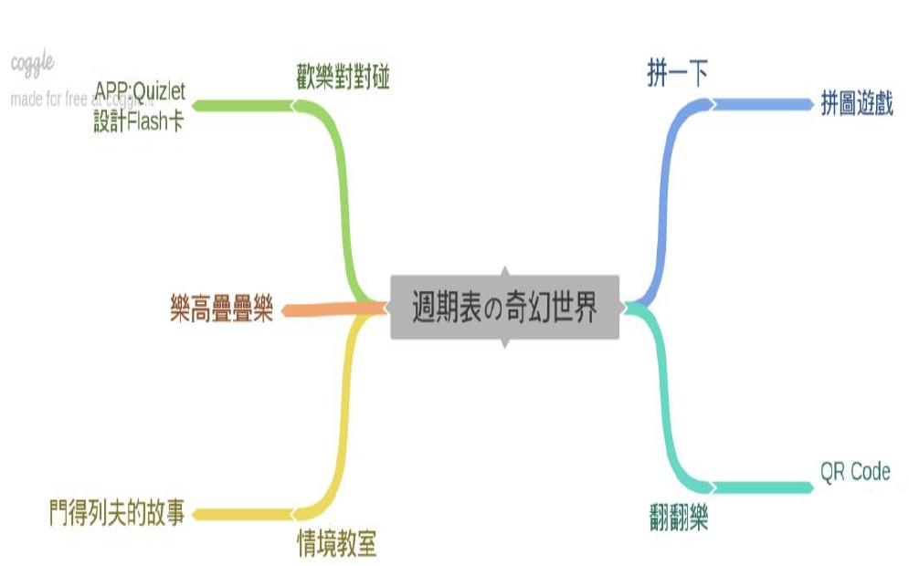 實踐國中自然領域教學團隊透過共同備課、對話、分析討論,將課程架構以心智繪圖的方式呈現出其關聯性和系統性,整體課程以「週期表的奇幻世界」為主題,包含:(1)拼一下、(2)翻翻樂、(3)歡樂對對碰、和(4)樂高疊疊樂。主題架構圖如圖2,