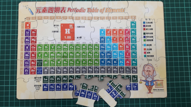 學生要能對整體週期表的架構一次看懂並且記憶,並不容易。因此,我們設計週期表拼圖遊戲,讓學生在規定的時間內拼出正確的圖形,並提供獎品。