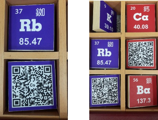 2. 再以QR-Code聯結大型立體教具翻牌架,增加趣味性,讓學生翻至元素背面,以平板掃描QR Code進行學習。週期表QR Code資料庫網址為https://reurl.cc/eXW5M。