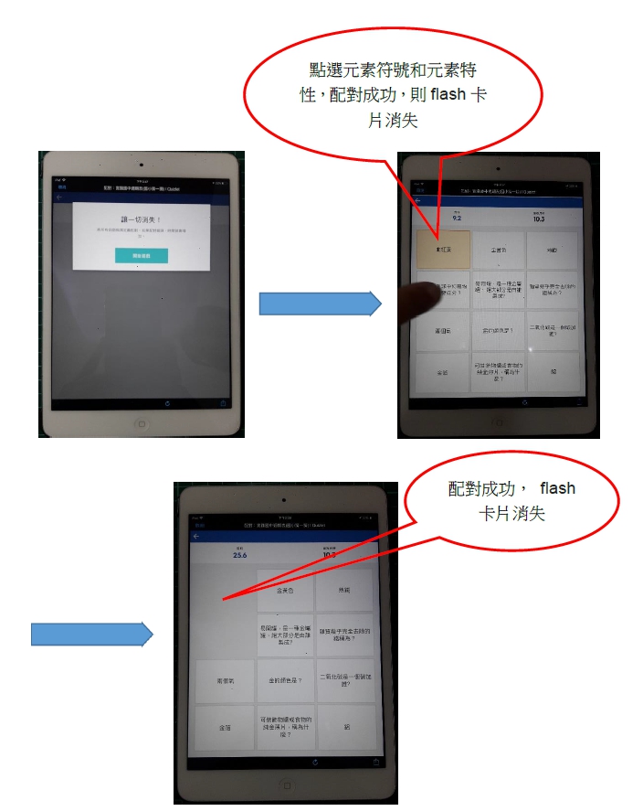 5. 只需將題目與正確答案在平板電腦上個別點選,即可消除flash卡,直到flash卡完全消除(即配對完成),且配對所花費時間最少者,可得到精美獎品。