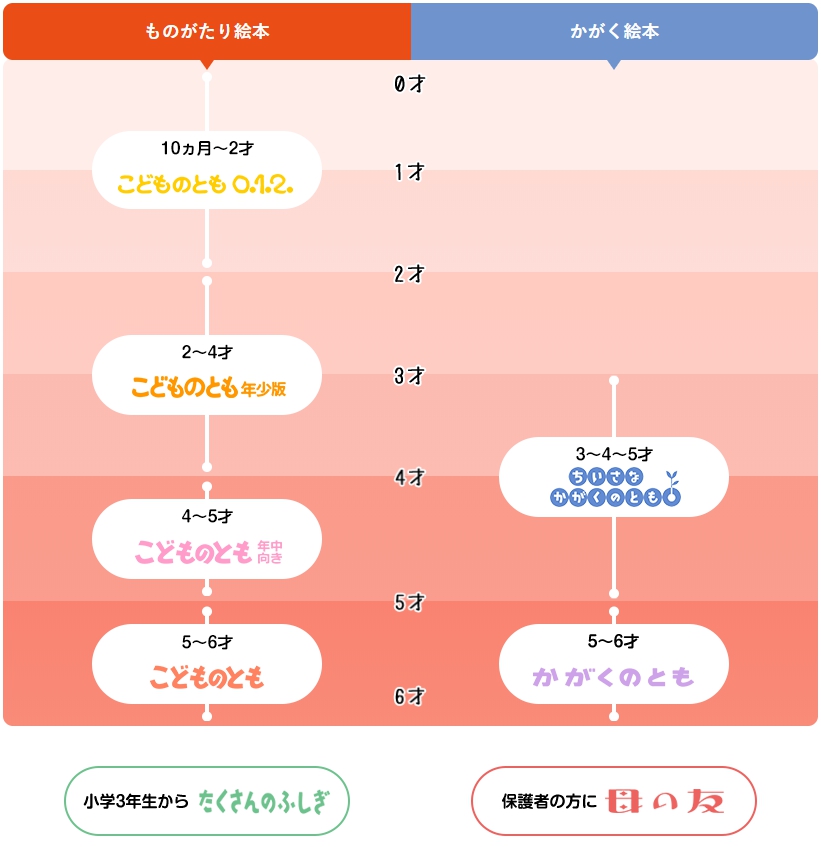 ちいさなかがくのとも》(小小科學之友)繪本月刊主要針對 3至 5歲的孩子,對於比較簡單且有趣的自然現象作介紹,因為是針對幼兒首次閱讀的科學繪本,所以並没有大量的科學知識,而是透過每個月提供讓孩子感動的主題,例如〈感受心臟的跳動〉讓孩子們有所感動,並願意嘗試、體驗與發現身邊熟悉的世界充滿了樂趣。而《かがくのとも》(科學之友)則是針對 5至 6歲的孩子閱讀設計,為了加強孩子們擁有強烈的好奇心,並讓心裡的科學種子萌芽與成長而定期出刊的科學繪本,並讓孩子們從不同的角度熟悉動物、植物、聲音與現象,並提供不同的視覺觀點。《たくさんのふしぎ》(大驚奇)科學月刊的主要讀者群為小學三年級以上,希望藉由呈現第一線的研究人員與專家學者經驗的引導,讓孩子們能夠發自內心感受、思考與理解世界中自然與環境、人類的生活、歷史和文化、數學和哲學等,具有許多驚奇且不可思議的現象(福音館書店)。