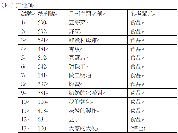 福音館書店除了出版日本當地創作及翻譯海外的繪本外,自1956年創刊發行月刊《こどものとも》(兒童之友)至今,亦是日本頗具歷史的雜誌月刊出版企業。其發行的定期月刊,依照不同年齡層的讀者對象及主題,可歸類以下四種類型(見表1):