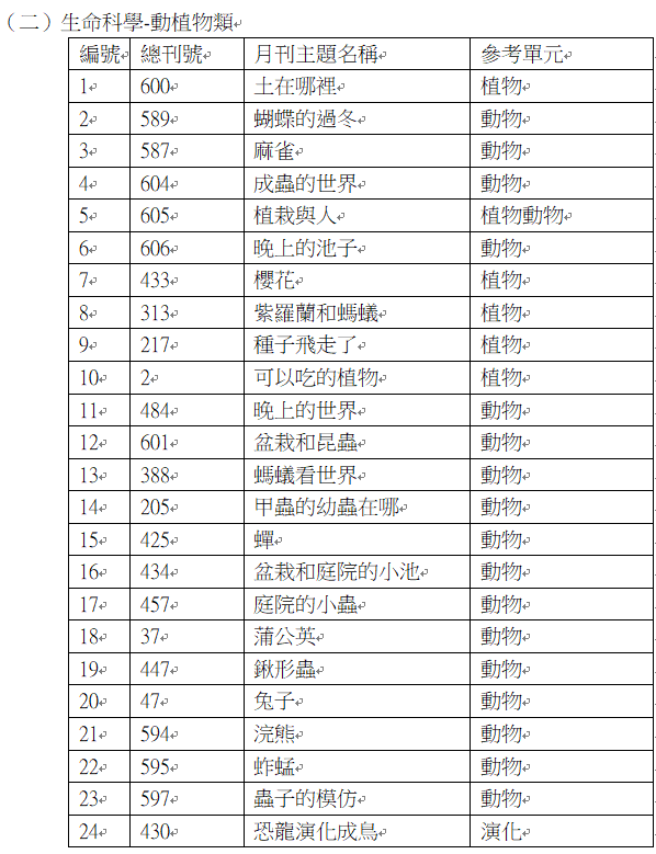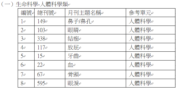 福音館かがくのとも主題中較為偏重自然、食物及身體的主題,物理科學及地球科學主題的書目數量則少於生命科學。從福音館かがくのとも50週年紀念展整理出暢銷的一百多冊作品中,作者針對生命科學(人體和動植物)、物理科學及地球科學和其他(食物為主)部分,挑選出適合親子共讀和教學運用參考的推薦書單如下: