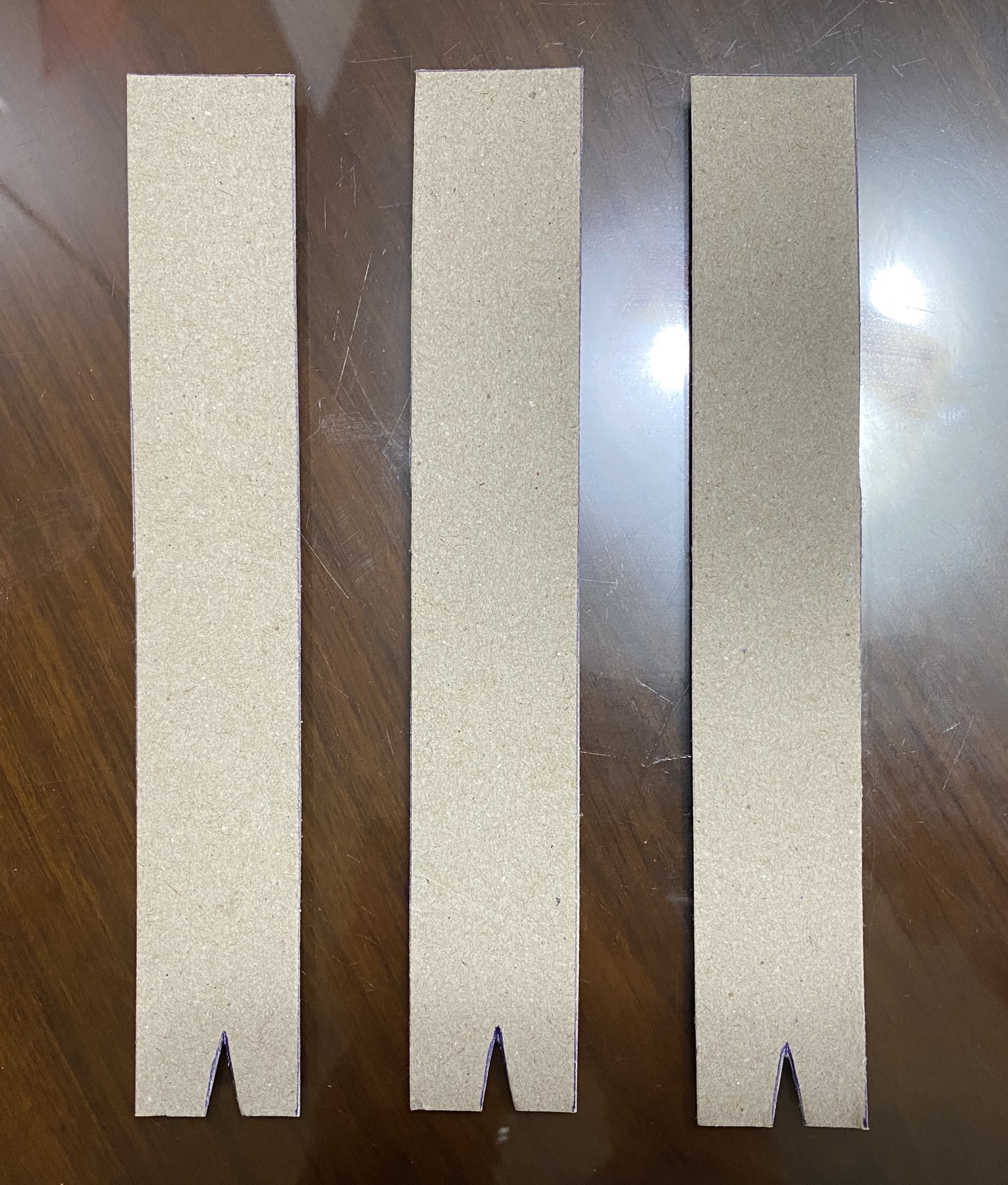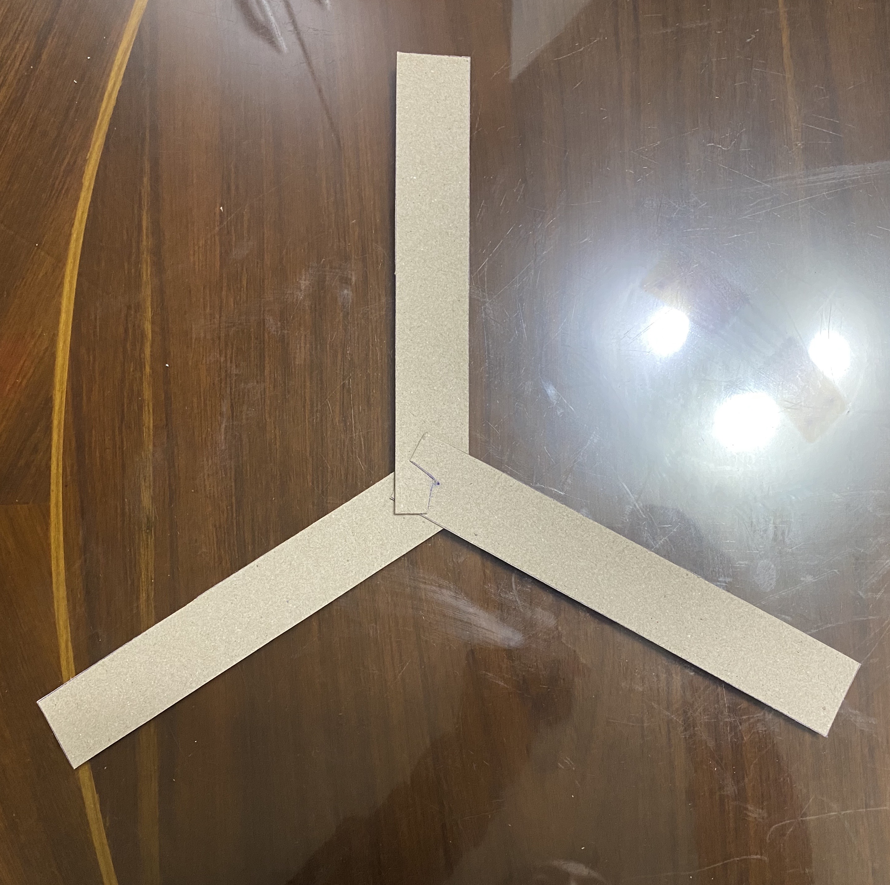 本階段最後需讓學生建立迴力鏢之原型(如圖1所示)。建議可讓學生剪裁三塊長約10-14公分,寬約3-4公分的馬糞紙板(本為初次製作之建議尺寸)。將每一塊紙板下方裁出高為1.5公分的小三角形缺口。將三塊馬糞紙板依120度夾角依序展開、插緊後,於中央處以釘書機固定之,最後在葉片前端處黏上1-2圈絕緣膠帶。