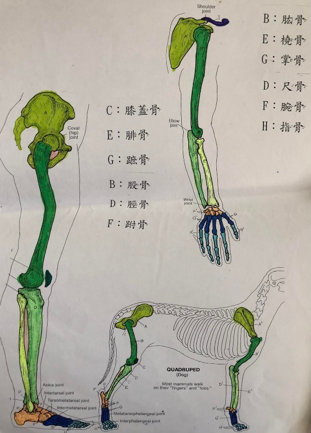 我認識了橈骨、肱骨、腕骨、肩胛骨等等,我也發現人的手骨和狗的前肢不同—原來狗一直是踮著腳尖行走的。