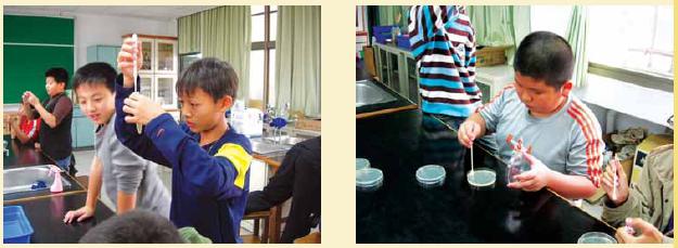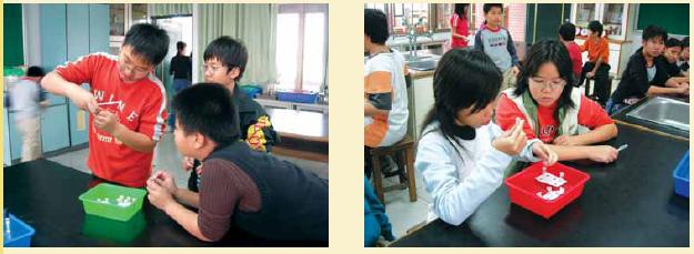 整個教學中,孩子們維持相當高的興趣,雖然我們使用據說最容易實驗成功的「番茄」做為材料,但由於實驗能力不精熟,而使得初次的DNA SPA,無法取得較大量的DNA,在孩子們強烈要求再來一次之下,第二天改用青蔥做為萃取的材料,有了前一天失敗的經驗,孩子們謹慎多了,冰酒精沉析出來的染色體也增加了,但問題來了,由於老師「撈取」的技術不好,總楚不小心將孩子好不容易做出來的「鼻涕狀的透明物」給攪散,只好向同事尋求協助。