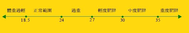 | 體重過重就是肥胖一族嗎?是耶? 非耶? 目前公認評估理想體重最常用的是 Body Mass Index(BMI)即所謂的身 體質量指數。BMI =體重(公斤)/ 身 高(公尺) 依衛生署的資料: BMI > 24 時為「過重」、BMI > 27 則為「肥胖」。但是這個不太適合 國小中學生,國小中學生是否肥胖, 應依照生長曲線的落點而定。當國小 中學生BMI 數值落在生長曲線的85- 94 ﹪百分位時,稱為「過重」;而落 在生長線的9 5 百分位以上時,算是 「肥胖」。 據調查,國內每100 位國小 中學生中約有15-20 ﹪,其BMI 有過重肥胖的現象;而這15 ﹪當 中,有高達50 - 60 ﹪的國小中 學生有心血管問題;另外25 ﹪有 高血壓、高血脂的現象。這與 BMI> 27屬於肥胖的成年人比較 (約有85 ﹪會出現包括高血壓、 高尿酸、高血脂、糖尿病、肝功 能異常......等肥胖症候群),不 可謂不嚴重! |