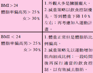| 其實「體重過重」並不代表肥胖,還得看身體脂肪累積的情形而定。正常男性油脂量約佔體重的15 -18 ﹪;正常女性油脂量約佔體重的20 - 25 ﹪。超過正常油脂量才算肥胖。 維持生命六大營養素中,如果脂 肪過多,超過體重20 - 30 ﹪時,就會 在體內沈積造成肥胖問題,依BMI 及 體脂率的情形, 減重方式也不盡相 同: |