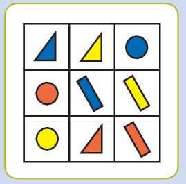 由兩位筆者在台北市的某個實驗場所拿這收教材對高年級小學生實驗的經驗,此題的下一個訊息是很難找到的, 5 個班各 30 位左右的學生,只有 3 個班各有一位指出,上排右的訊息此時已然可用:黃衣刀所站位置在九宮陣的上排,他所在那行的下排是位拿盾的人,但下排的中問和右邊已有兩把刀,故這位拿盾牌的人一定在下排左的位置,黃衣刀也確定在上排左的位置,如右圖所示。