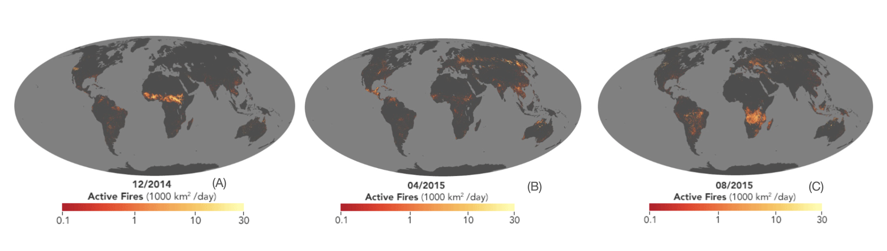 在全球每年至少出現10,000起活躍的大火,有70%發生在乾燥的非洲。12月和1月,非洲大陸北部爆發出大量烈焰(圖一(A)),隨著季節遷移在半年之後火燒地區轉移到南部(圖一(C))。尤其在每年四、五月間,北半球因農民清理及維護農地,於是火場散佈在整個歐亞大陸、北美和東南亞(圖一(B))。南美和赤道亞洲的熱帶森林中,由於人們利用乾旱季節清理雨林和熱帶稀樹草原,為了阻止樹木和灌木叢再度侵占他們已經清理過的土地,大火會在8月、9月和10月爆發。北美地區和歐亞大陸的寒帶和溫帶森林,在夏季也常因偏遠地區的閃電等自然因素點燃而引發大火。