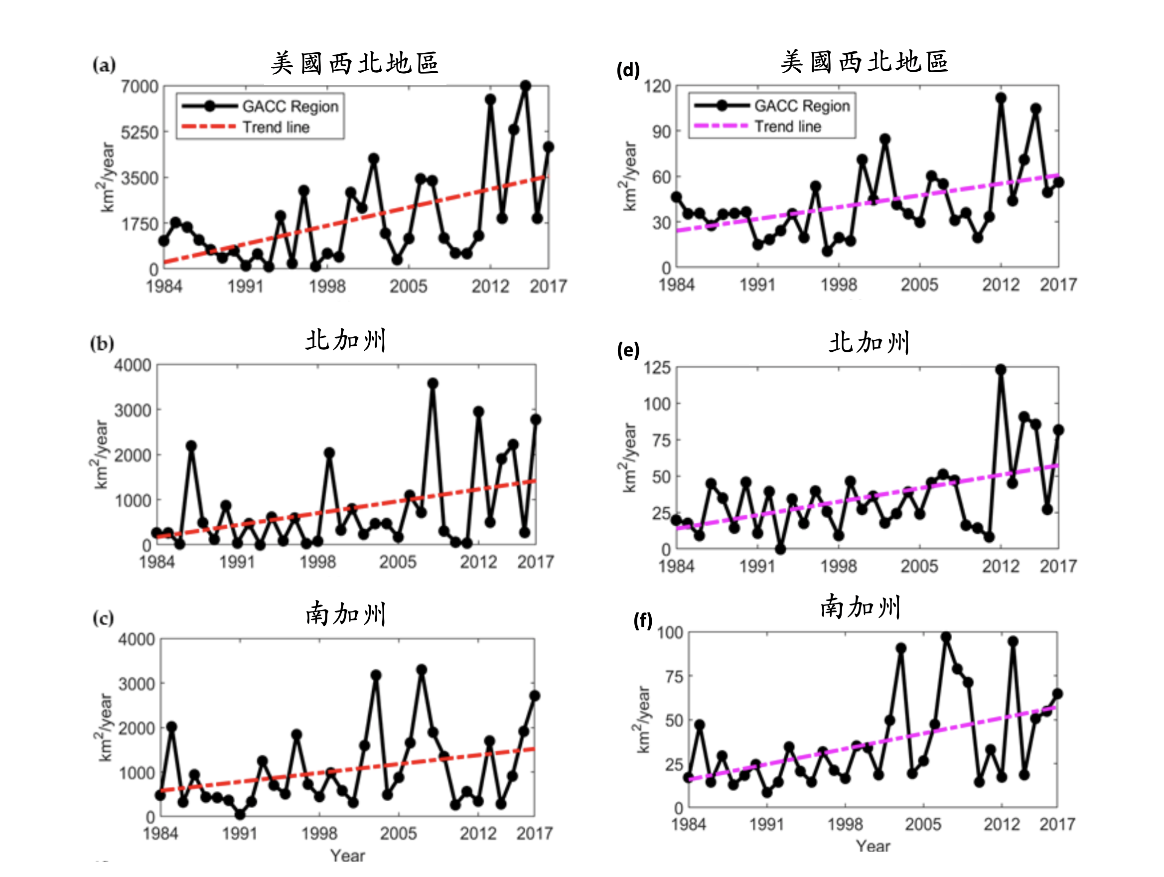 圖二.近34 年來美國西北地區和加州的大範圍野火燃燒面積都有增加趨勢(Salguero, Li, Farahmand and Reager,2020) 。