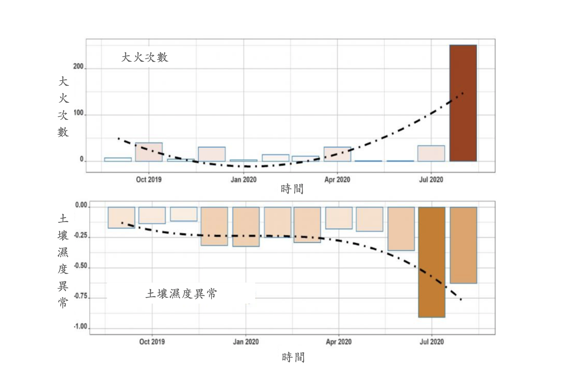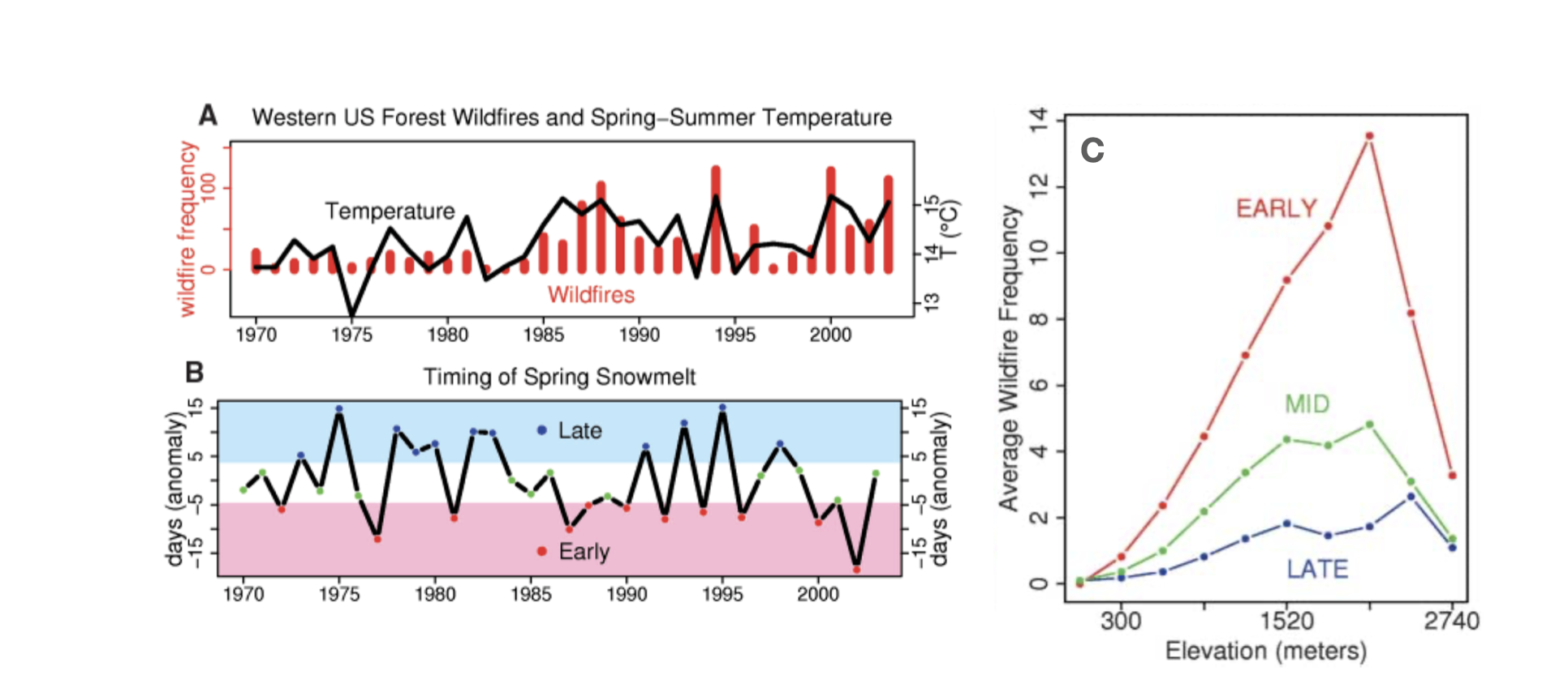 在全球暖化的大背景下,許多氣候趨勢研究指出:美西的春天將更早來臨,積雪較早融化,空氣與植物乾燥時間拉長,而降雨較晚、降雨量不穩定,降水量減少,一旦森林地區格外乾燥,不單容易發生火花,火季也將隨著氣候變暖而延長了。學者早已預料加州的大火會愈頻繁且更加持久、規模擴大且更為嚴厲。至於影響大火的因素,Westerling等人(2006)在科學(Science)期刊上發表的研究結論:春夏季的高溫以及春季融雪提早1-2週,使森林大火發生的頻率增加四倍,野火蔓延時間(從發現火點到控制)也從平均一週延長到超過五週(針對1986年到2003年大於400公頃的大火和之前的16 年相比)。他們發現:如果冬季降水減少、氣溫升高,春天融雪又提前出現,早春和持久的炎熱夏季,會導致森林等植栽更為乾燥是大火頻率增加主要的變因(圖三)。他們也針對大火分布的區域,比較人類改變土地利用的方式和氣候變遷的影響,以洛磯山脈為例說明氣候變遷的影響比土地利用的改變更為劇烈,認為僅就森林燃料的管理研擬策略,也難以逆轉野火增強的趨勢。