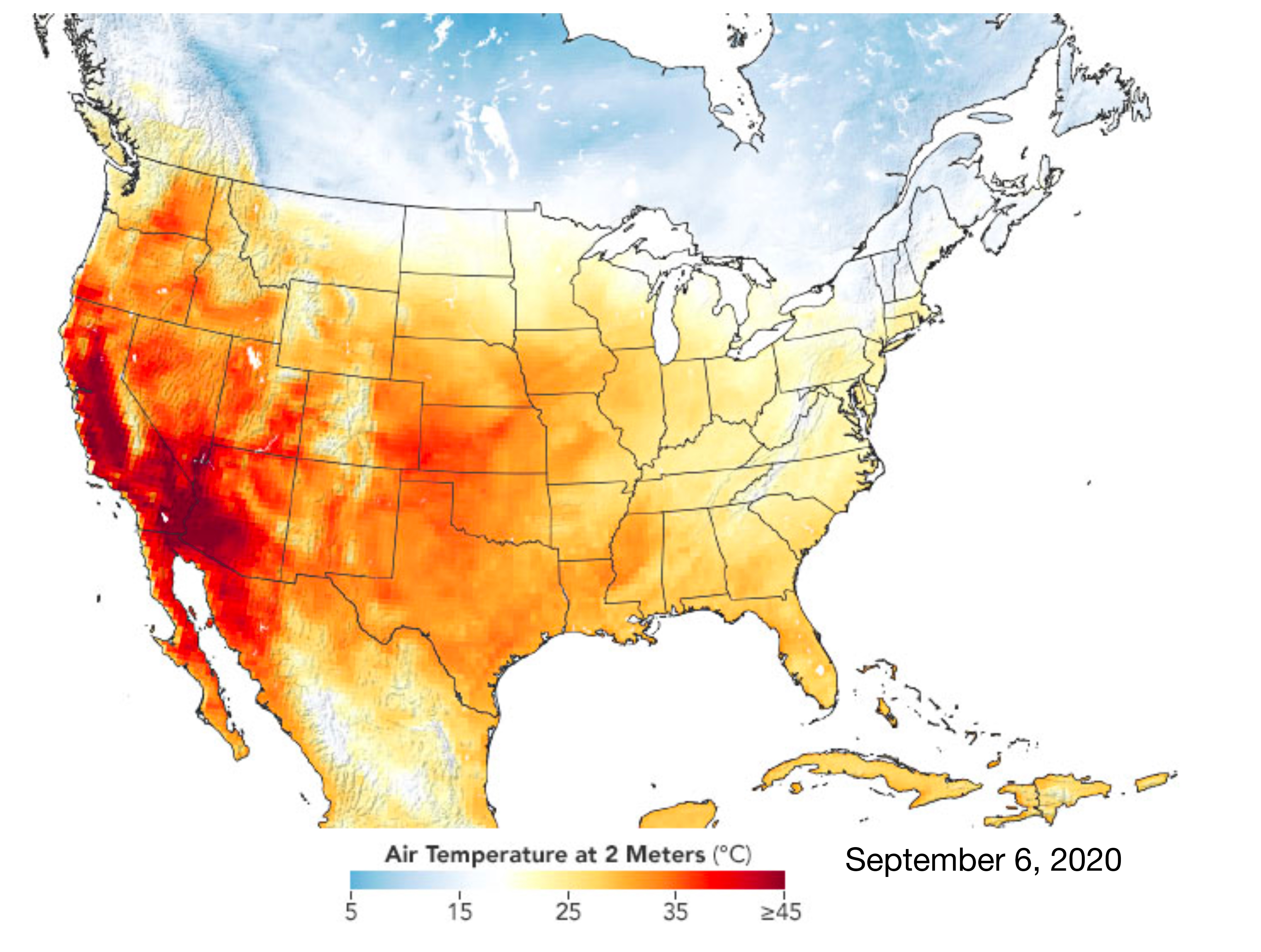 圖五.2020年9月6日美國西南部的氣溫,當時西南部的大部分地區被劇烈的熱浪烘烤,此圖根據NASA NOAA衛星影像經由GEOS模式整合Goddard Earth Observing System,代表在離地表2公尺高處的氣溫,最暗的紅色區域氣溫度超過113°F(45°C)