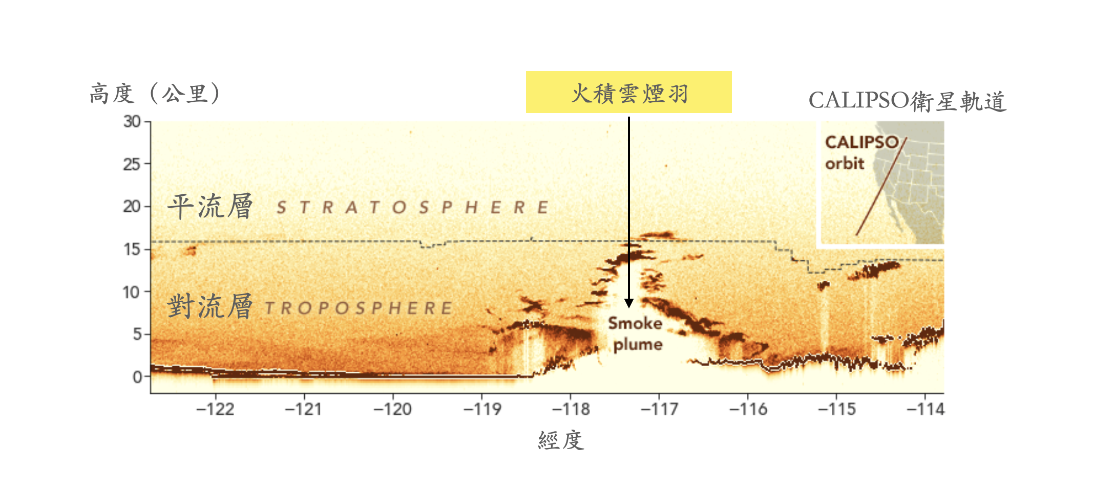 圖六.9月7日衛星觀察到來自加州的creek大火爆炸性火積雲的煙霧,衝破對流層頂的高度。