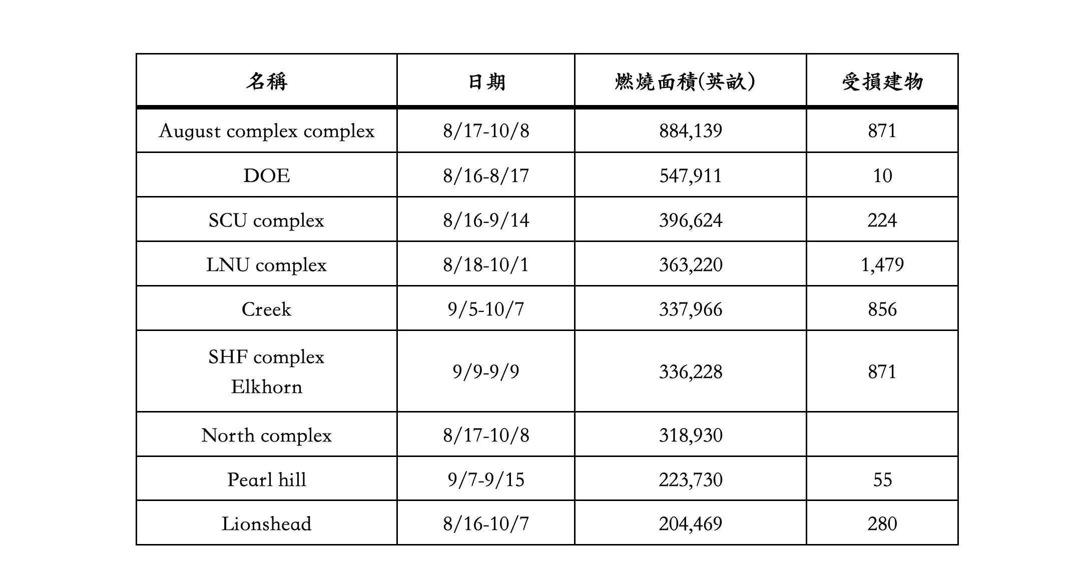 表一:2020年至今美國大火最嚴重的案例,今年初至10/9全國燃燒面積總計12,925,420英畝,受損建物16,607棟,滅火經費3,082,891,713美元。資料來源:美國國消防中心 National Large Incident Report