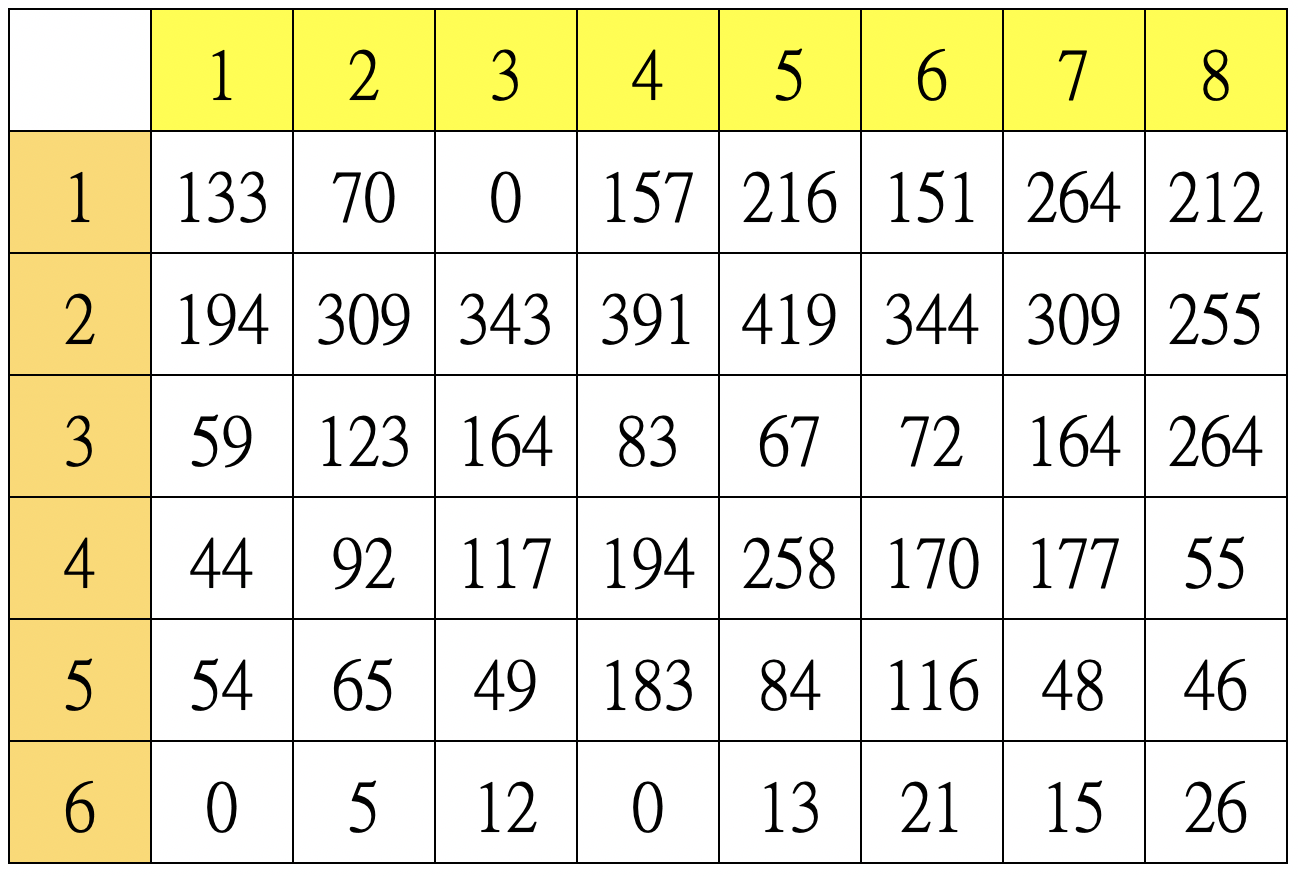 表4.48個分割區的特徵值,此值為亮度值加總開根號,因為越亮表示位移越大,開根號是因為像素總數表示面積,開根號才表示邊長,邊長跟位移較有正相關性。