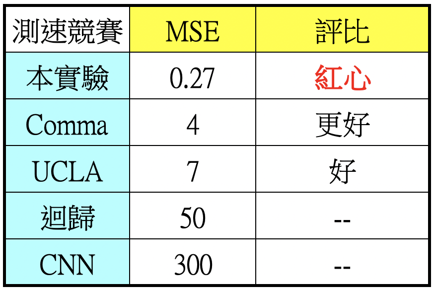 筆者最佳結果為0.27MSE,是為紅心。然而在得到紅心解之前,筆者嘗試了常用的迴歸和CNN來訓練模型,但結果慘不忍賭,誤差太大導致模型不堪使用。美國UCLA大學資料團隊也有進行挑戰,使用的是ResNet,以每個像素點為Input神經元,測得7MSE不錯結果。出題人Comma.ai則能做到4MSE,相當於2MPH速度誤差。後來筆者使用opencv從原始圖像處理著手,有了好的圖資再加上分區取特徵方式達到0.27MSE,相當於0.5~0.6MPH誤差。能達到紅心解主要差別應是利用opencv的光流演算法進行資料前處理,之後再分48區段擷取特徵,而不是每個像素點都視為Input,不僅將訓練時間從數小時縮短至數分鐘(筆者使用Macbook Pro筆電進行訓練),並且大幅提高準確度,各㮔方法結果簡列如下。