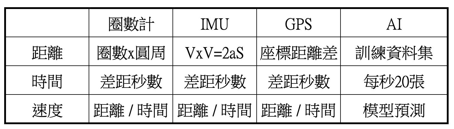 第2種測速方式也是用物理方法進行計算,透過車內的加速度慣性感測裝置(IMU sensor),配合牛頓運動學公式算出速度: